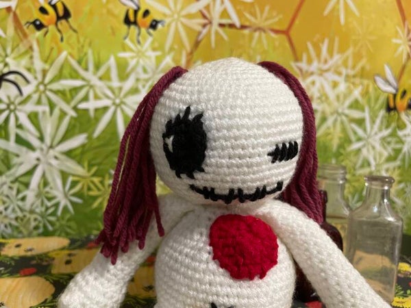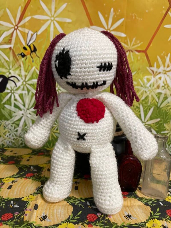 Need to teach someone a lesson or help them? This handmade crochet voodoo doll represents a female. Use it to cast spells, heal others, or fulfill your intentions. It stands 10 inches tall, perfect for bodily casting. With pigtails and a red heart, she's your companion and helper.